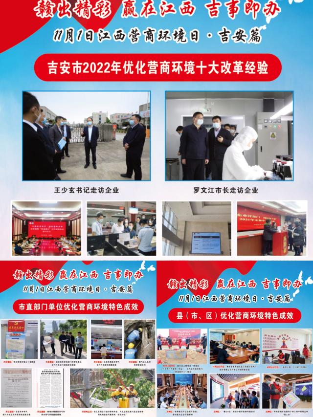 各县(市、区)、市直相关单位聚焦营商环境工作重点,报送了一批推进营商环境优化升级特色成效图片。市营商办选取了百余张图片,分体育365网投_365bet365用址_365bet官网提现说维护2022年优化营商环境十大改革经验、市直部门单位优化营商环境特色成效、县(市、区)优化营商环境特色成效三个单元,以“赣出精彩 赢在江西 吉事即办 11月1日江西营商环境日▪吉安篇”为主题,于11月1日在市政府门户网、市发改委官网进行了展示。